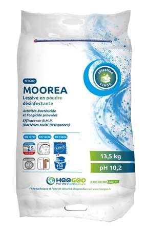 Lessive en poudre désinfectante à action curative immédiate destinée à la désinfection des textiles en environnement médical.